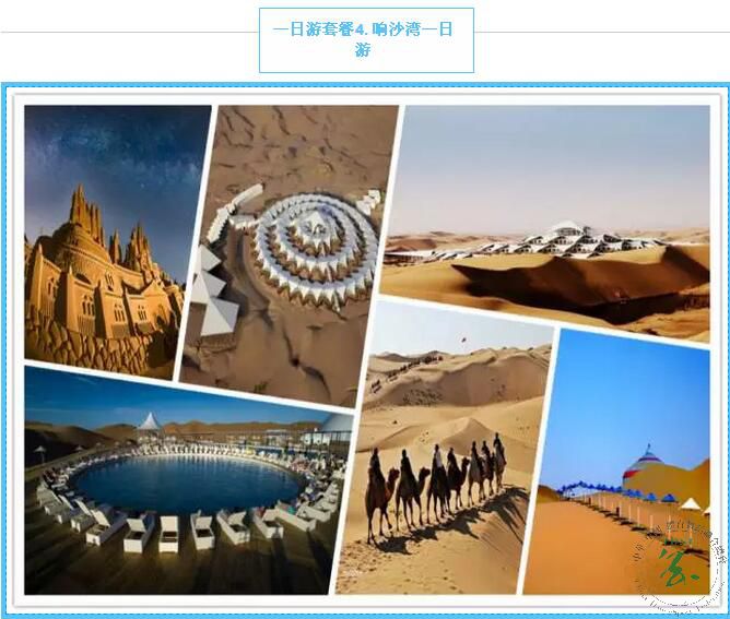上午:赴中国5A级景区——响沙湾旅游区,乘坐沙漠观光索道进入沙漠娱乐区。这里的沙子只要受到外界撞击,或脚踏、或以物碰打,都会发出雄浑而奇妙的“轰隆-轰隆”声,因此,人们风趣的将响沙称作“会唱歌的沙子”。
