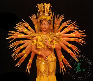 舞剧《千手观音》是太原市委、市政府历经7年打造的走向世界的文化品牌。舞剧在广为流传的千手观音故事的基础上重新创作,通过12首颂歌、12段舞蹈、12幅画卷演绎了一段极具寓言色彩的故事:乐善好施的三公主为救父王请命寻莲,历经万难,面对苦海中受难的芸芸众生,她毅然献出了“莲花”。该剧堪称弘扬真、善、美,礼赞和谐、大爱的颂歌,蕴涵着“只要心地善良,心中有爱,就会伸出一千只手去帮助别人;只要心地善良,心中有爱,就会有一千只手来帮助你”的深刻寓意。