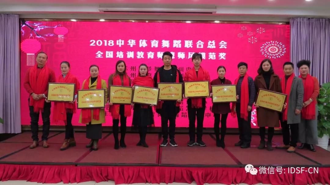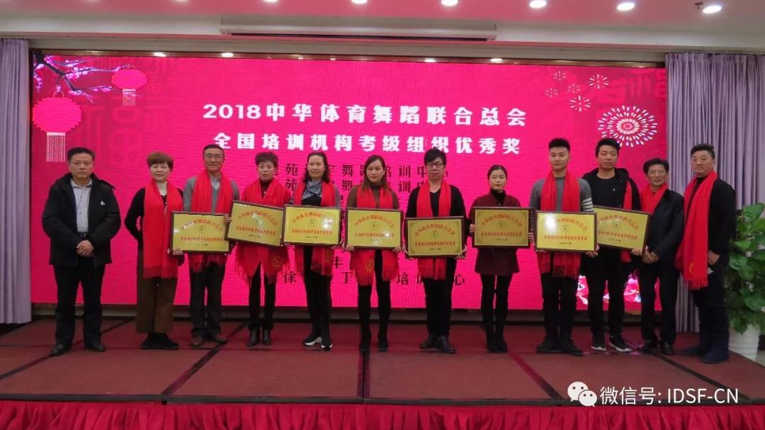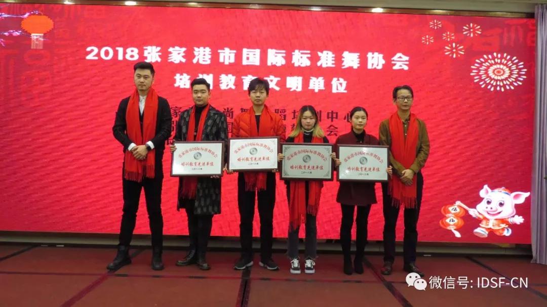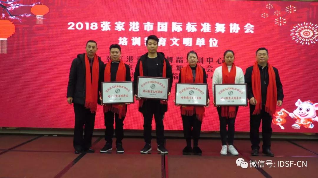 张家港市社科联主席、张家港市文联主席钱晓东、张家港市政协副主席李汉忠、江苏淮安体育舞蹈协会会长、中华体育舞蹈联合总会江苏分会会长等嘉宾做了指导发言。 靖江市银河艺校校长、总会秘书长丁雅琴宣读2018年度中华体育舞蹈联合总会先进集体、先进个人名单 荣获2018张家港市国际标准舞协会培训教育先进单位的分别是:1758 舞蹈学校、王波拉丁舞培训中心、悦舞工作室、张家港易道教育 荣获2018张家港市国际标准舞协会培训教育文明单位的分别是:张家港爱尚舞舞蹈培训中心、张家港国标舞塘桥分会、张家港金港舞蹈培训中心、尚舞文化艺术培训 荣获2018中华体育舞蹈联合总会、全国培训教育师德师风模范奖的单位分别是:常州天艺艺心舞蹈培训中心、苏州佳梦舞蹈培训中心、常州岸嘉舞蹈培训中心、江阴星光舞蹈培训中心、宜兴惠宁舞蹈培训中心、江阴中韬江美艺术培训中心、四川达州舞缘体育舞蹈艺术学校、张家港市乐余爱尚舞舞蹈培训中心 荣获2018中华体育舞蹈联合总会、全国培训机构考级组织优秀奖的单位分别是:鹿苑鸿宇舞蹈培训中心、鹿苑青泉舞蹈培训中心、常州舞之星舞蹈培训中心、常州涓子舞蹈培训中心、无锡满天星舞蹈培训中心、宜兴风尚舞蹈培训中心、南丰少年宫、泰州徐霞拉丁舞蹈培训中心