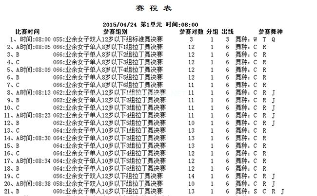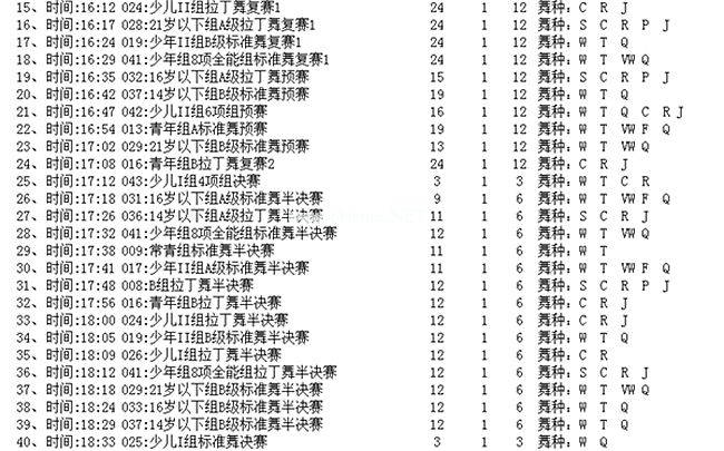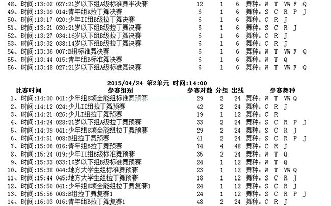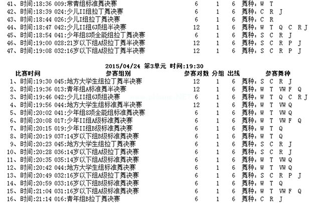 导读:2015年WDSF大奖赛(武汉站)暨中国体育舞蹈公开赛(武汉站)24日赛程表 特别提醒:报到之后也许会有微调,请以赛场公布的赛程为准。