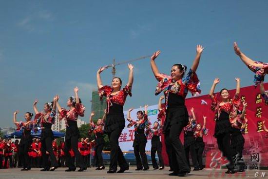 5月12日上午,吉首市人民广场分外热闹喜庆。 “和谐馥郁杯--谷韵放歌.舞动吉首”第二届群众广场舞大赛的32只代表队在这里齐舞“吉首吉”, 共绘“梦湘西”。