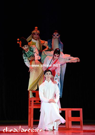 舞台之上,生、旦、净、丑四个人物先后登场,四个人物是京剧的某种象征,也代表着梅兰芳的四种性格。他的魅,他的武,他的文,他的嗔,就这样缠绕着他,一起舞动,诉说着他为京剧付出的人生况味。随后,虞姬、苏三、杜丽娘、林纽芬也一一登场了,这是在他的演绎下力臻完美的几位“角儿”。还有京剧舞蹈化的第一出戏—《天女散花》随之登场,情之所至,梅兰芳甩起长长的绸子,尽兴地来了一段绚丽的绸子舞,这可是他在京剧演出中的一大突破……