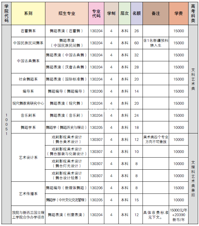备注:北京舞蹈学院与新西兰国立理工学院合作办学项目——舞蹈表演(创意表演)。学费标准为:北京舞蹈学院15000元/年,新西兰国立理工学院20390新币/年(1年包含2个学期)。