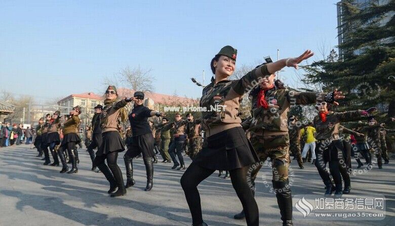 北京广场舞升级水兵舞 大妈身穿迷彩制服着长靴舞动
